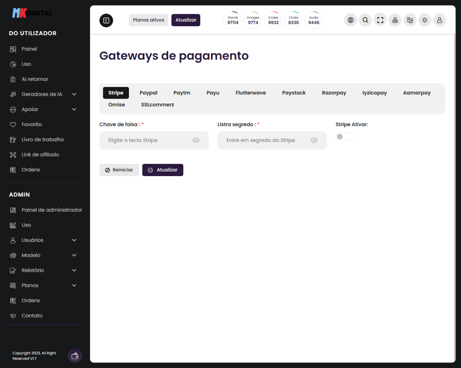 - 6 gateways de pagamento (PayPal, Stripe, PayTM, PayUMoney, Flutter Wave, Paystack)