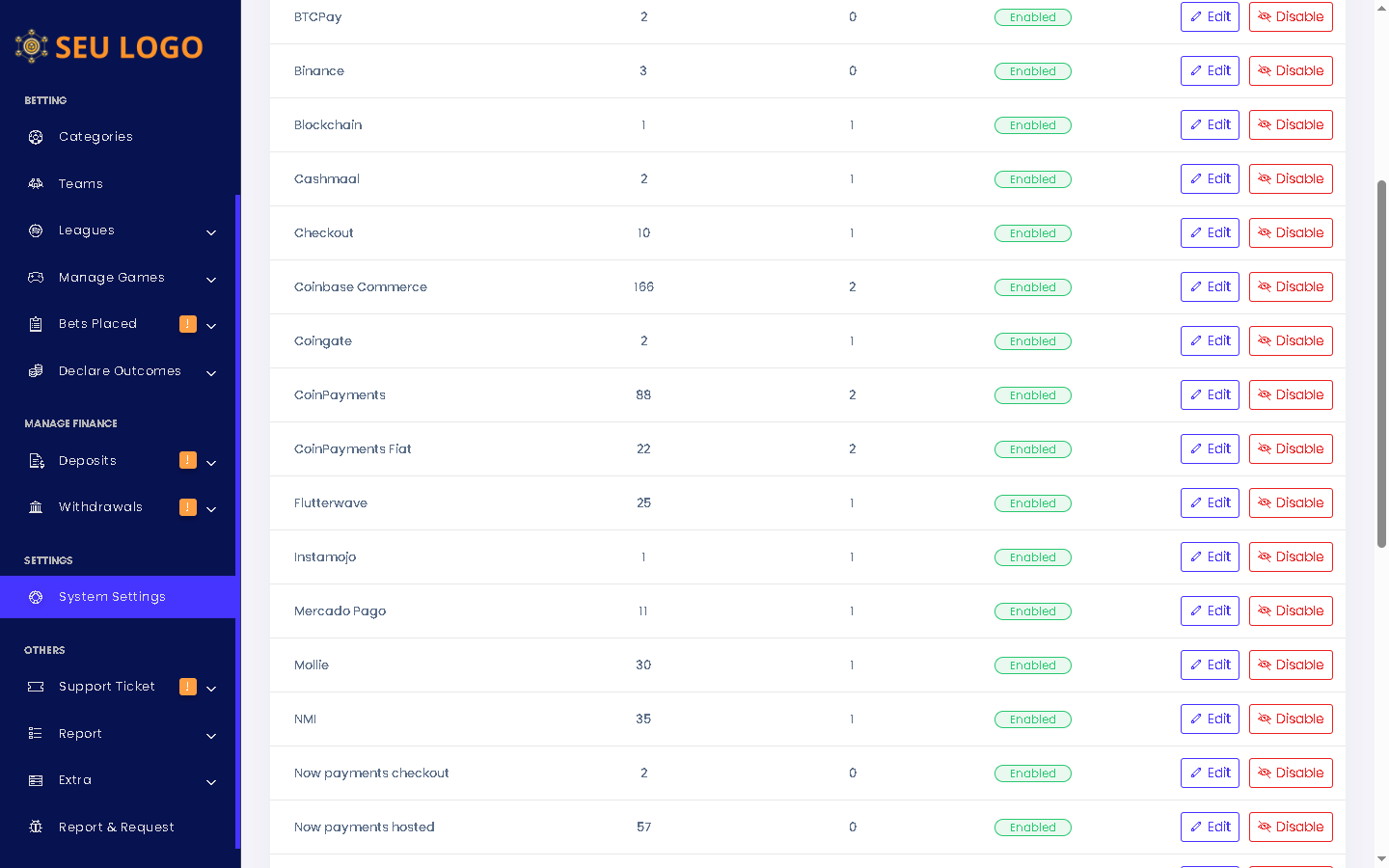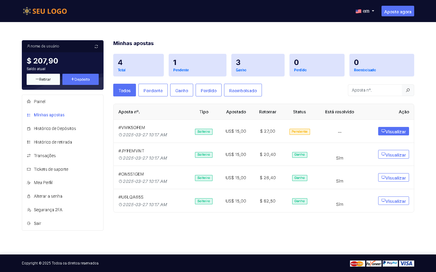 Ela oferece um sistema abrangente onde os usuários podem fazer apostas em esportes e jogos ao vivo, diretamente ou por meio de indicações. O painel de administração fornece controle total sobre os usuários, gerenciamento de jogos, supervisão de apostas ao vivo e seleção de vencedores.