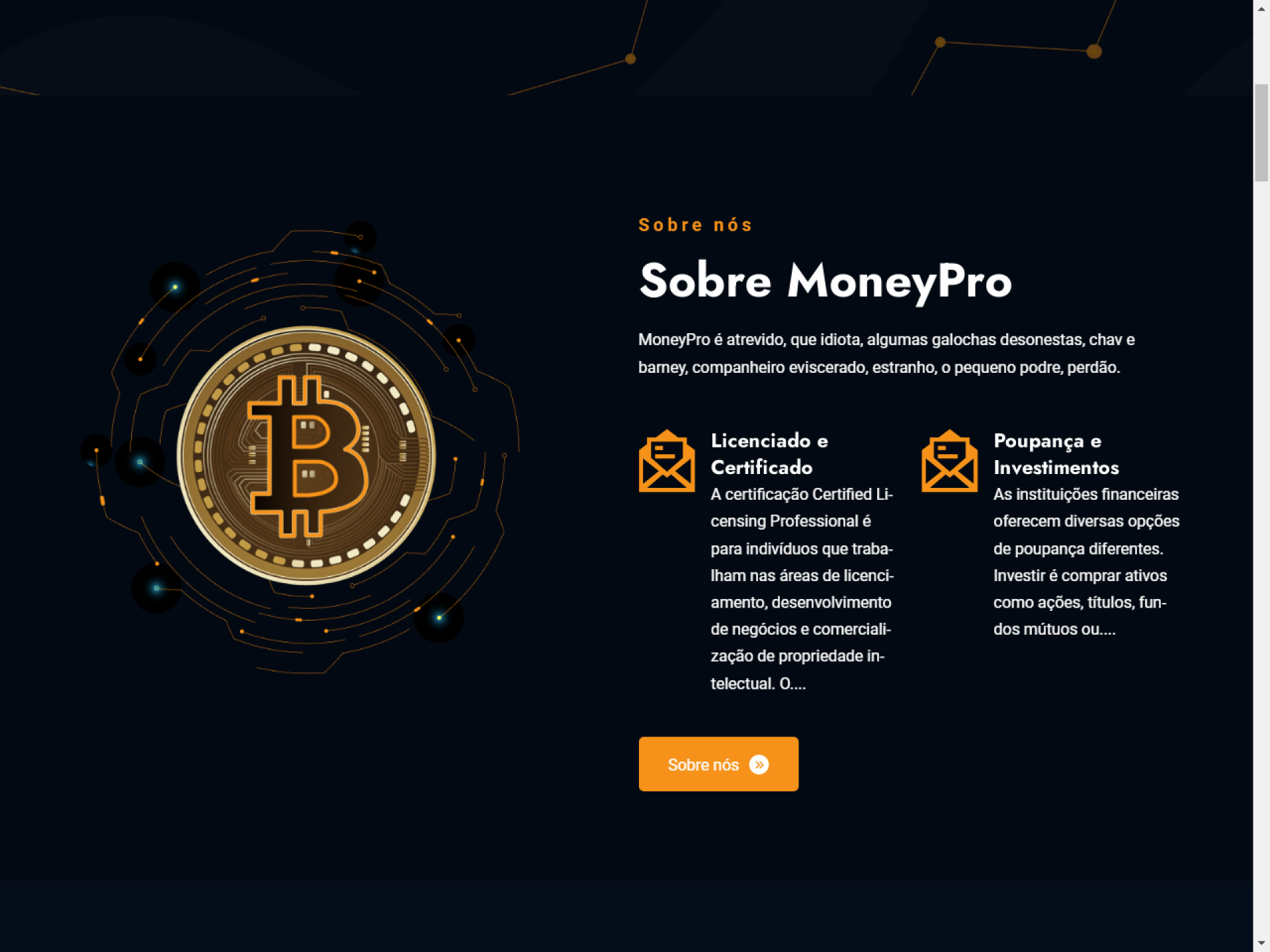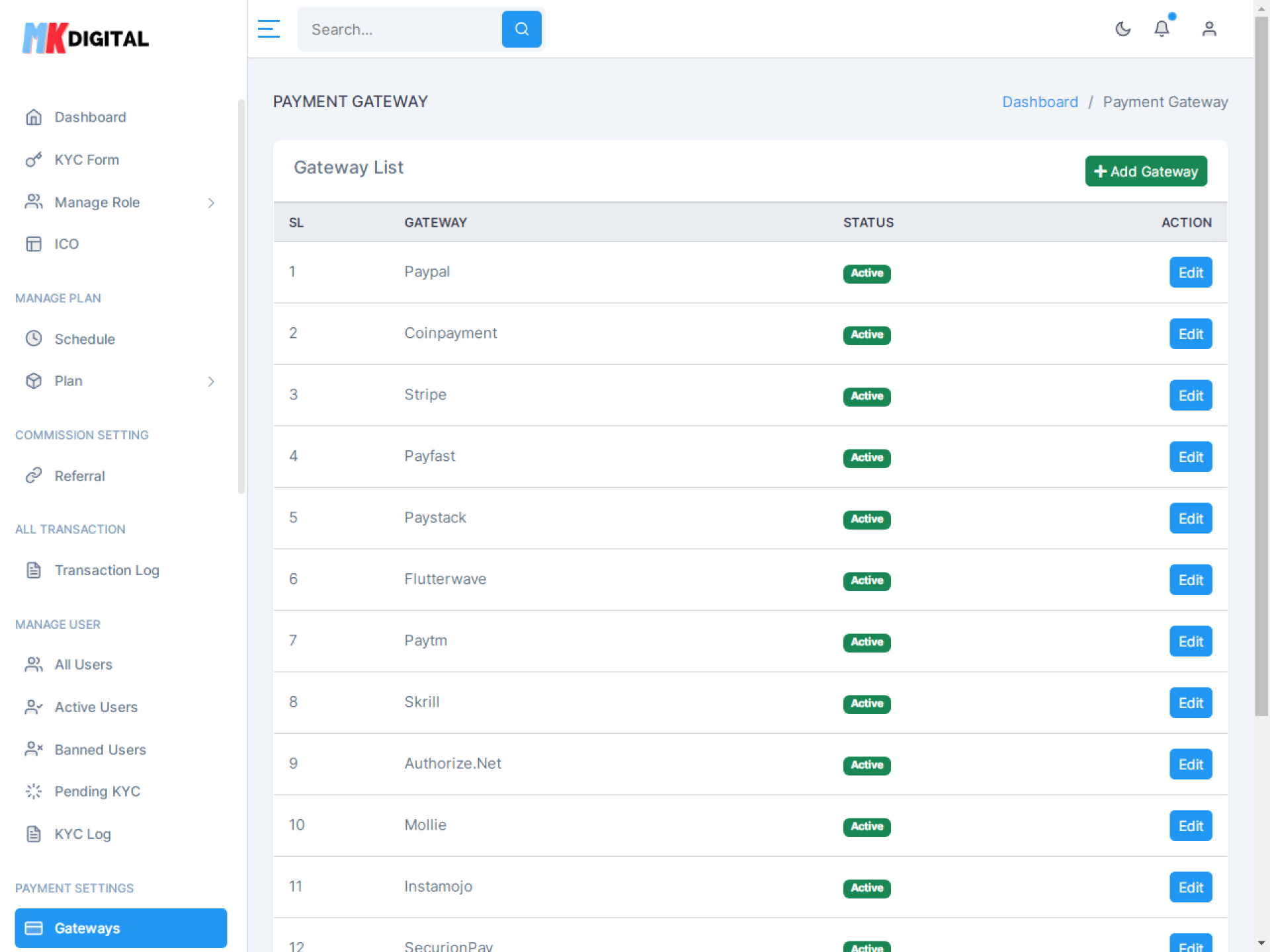 Plataforma de investimento on-line Multiprrpose Wallet e Banking. É uma plataforma web totalmente funcional para gerenciar sua carteira, plataforma bancária e de investimento online de maneira conveniente. Ele permite que você registre usuários, receba depósitos, remeta ganhos e processe ganhos de ROI de nível único e multinível. você poderá configurar sua própria plataforma o mais rápido possível. Os principais gateways de pagamento e criptomoedas suportados incluem Stripe, Coinpayments (BTC, ETH, LTC, DASH, XRP e BCH) e Paypal.