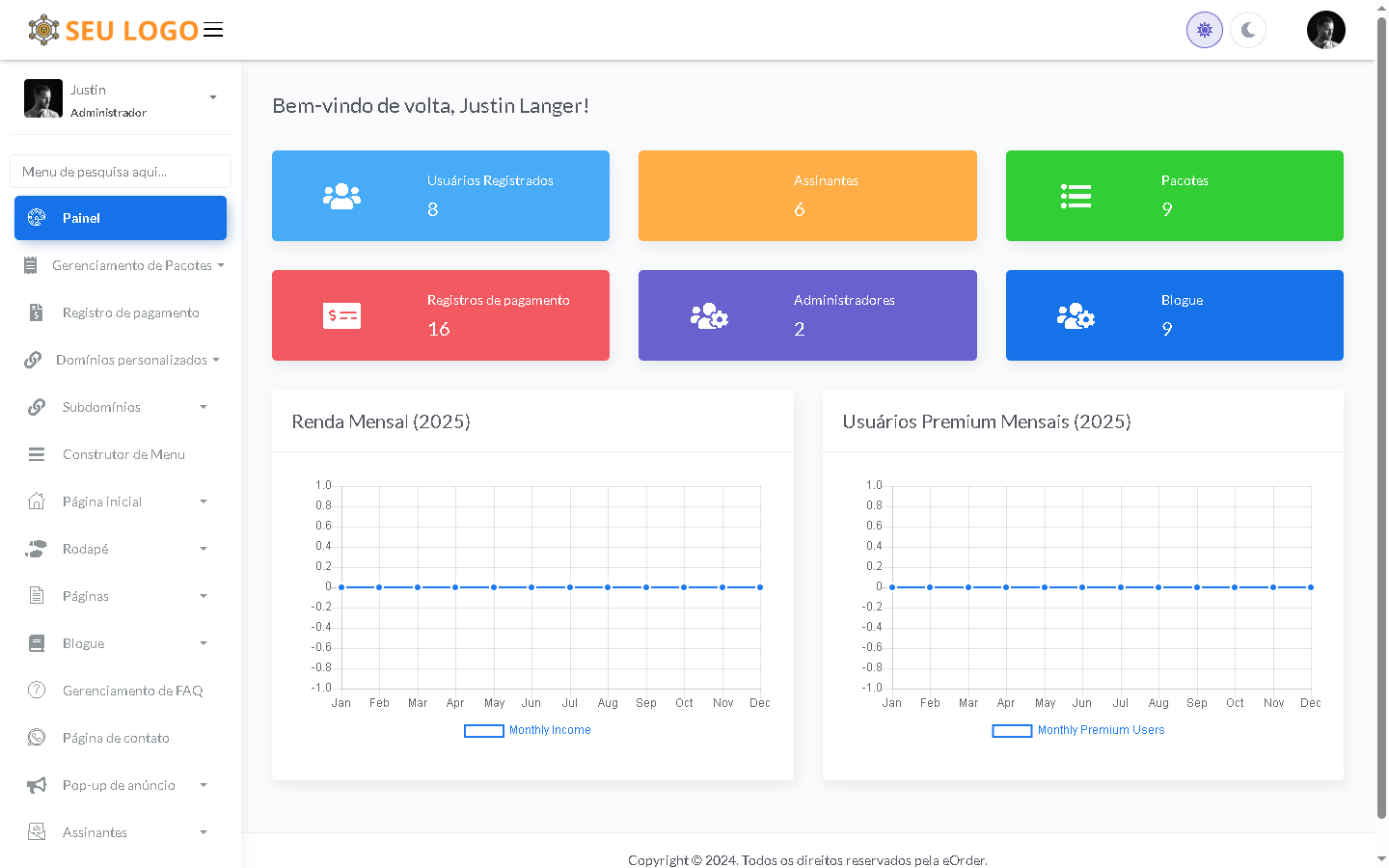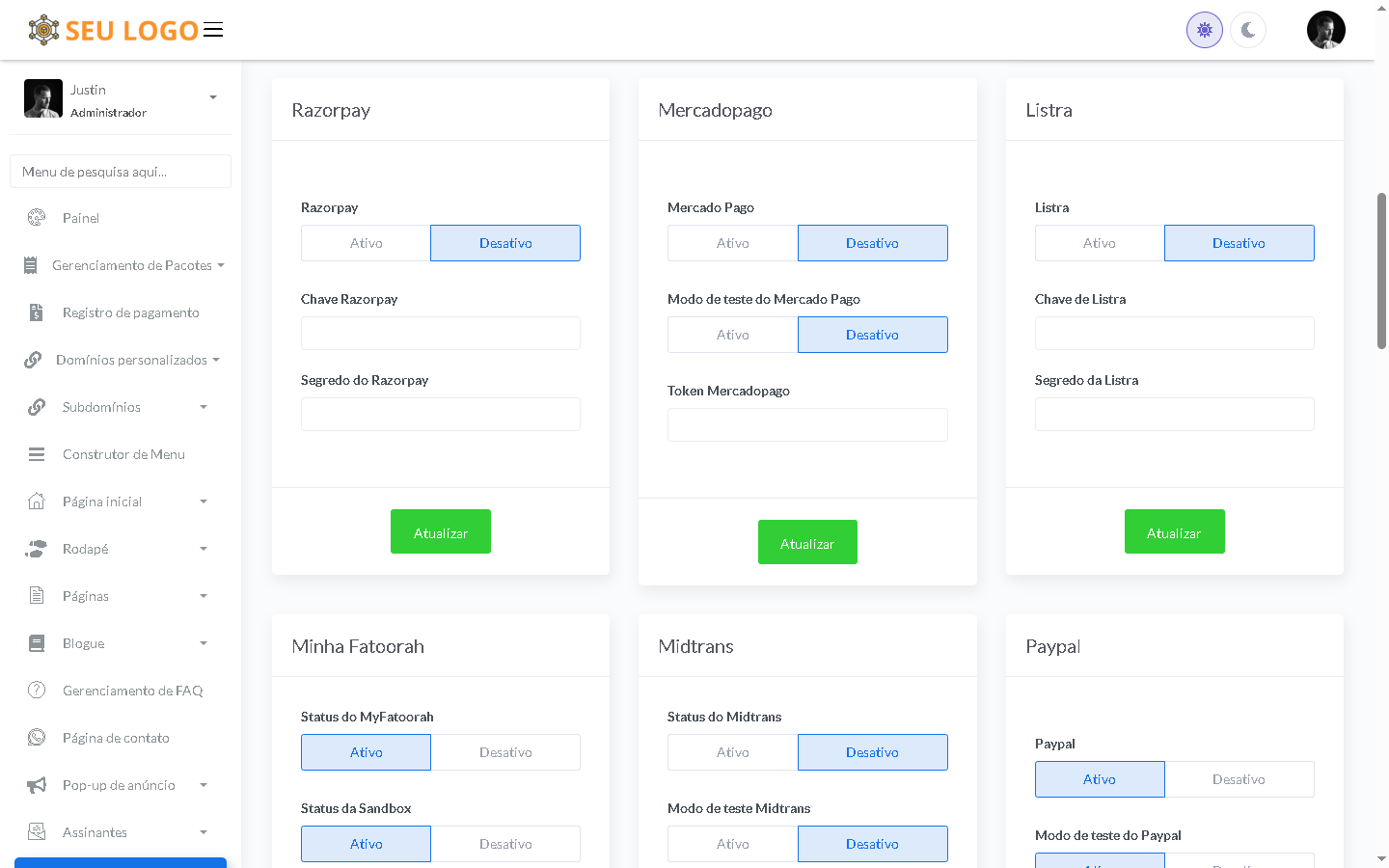 Funcionalidades do painel de administração: