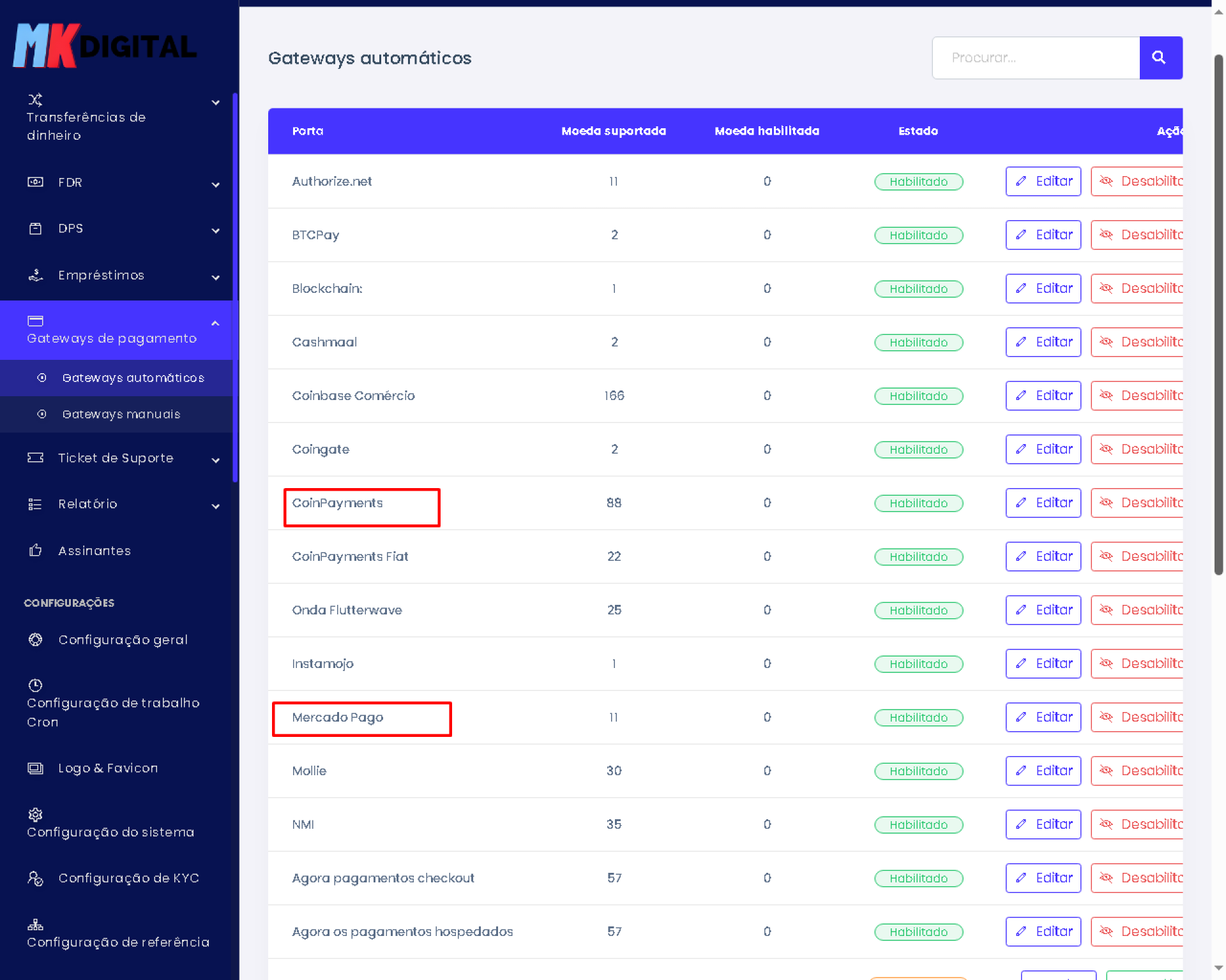 - Gerenciar gateways de pagamento.