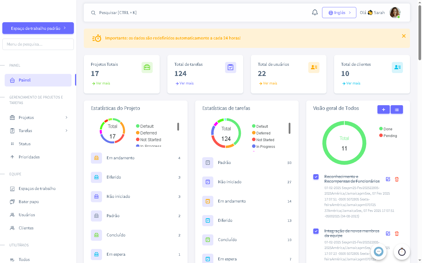 Visualize projetos, tarefas e métricas de produtividade em um painel intuitivo. Acompanhe aniversários da equipe, datas importantes e membros em licença.