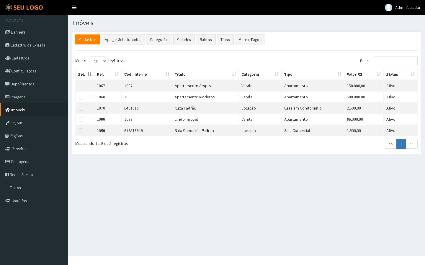 Painel administrativo intuitivo para gestão de imóveis, corretores e clientes