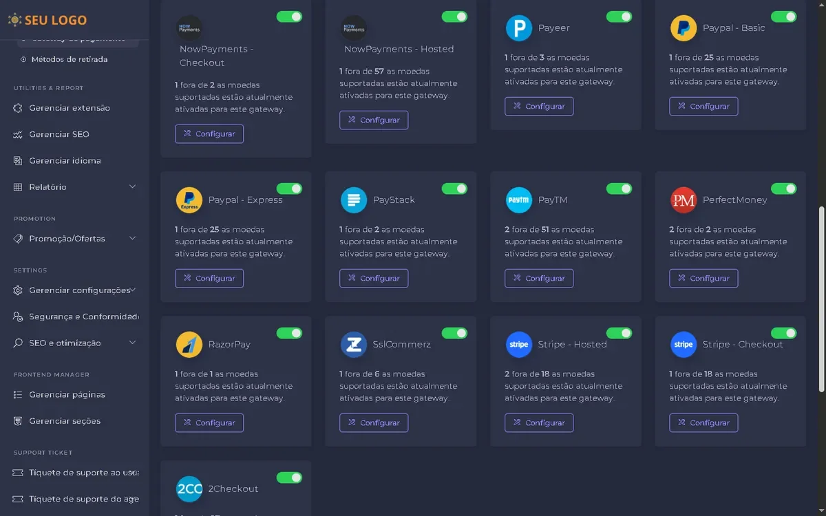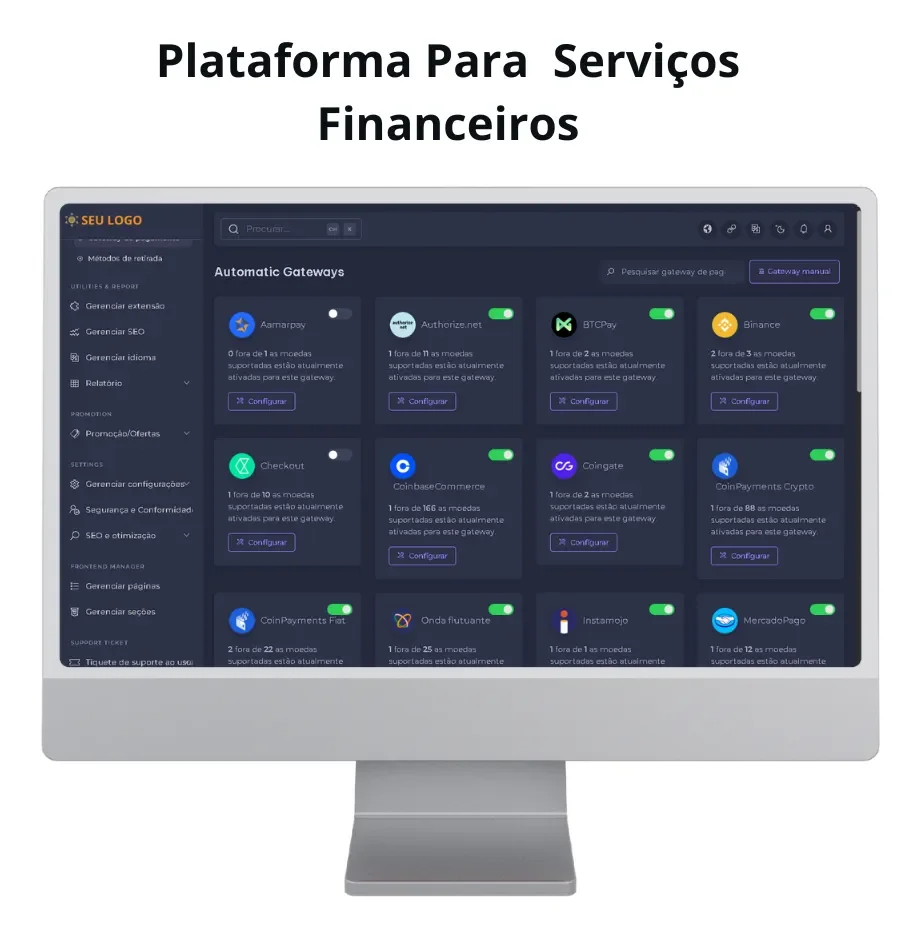 um painel de administração intuitivo e abrangente que fornece controle total sobre as operações da plataforma, desde o gerenciamento de usuários e transações até a configuração do sistema.