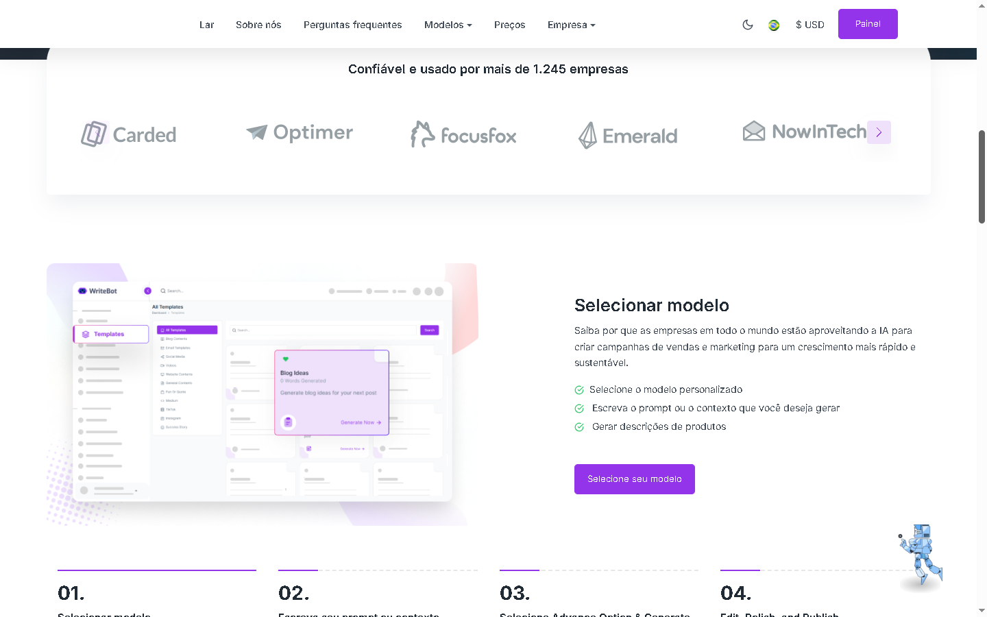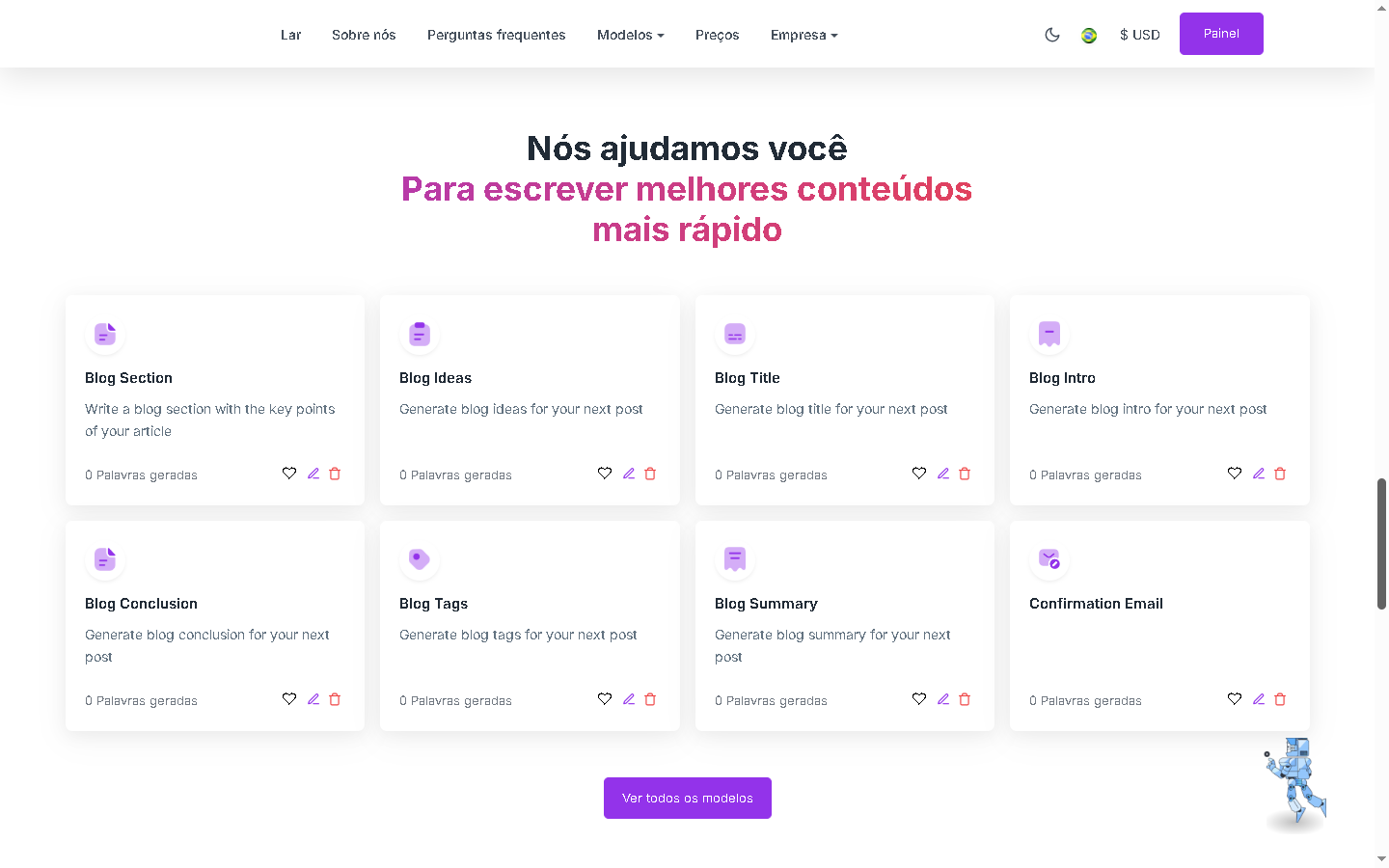 Ele foi projetado para ajudar você a gerar textos de alta qualidade instantaneamente para todos, como profissionais de marketing, redatores, jornalistas, profissionais de comércio eletrônico, educadores, gerentes de mídia social, blogueiros, especialistas em SEO, redatores de conteúdo, agentes de suporte, compositores e muito mais . Você também pode editar, exportar, mover ou publicar facilmente seu resultado gerado por IA.